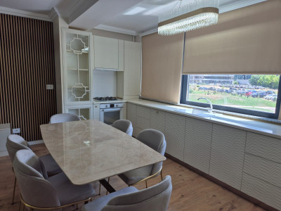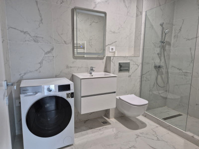 Apartamentul – este compartimentat astfel: intrarea se face intr-un hol generos ce dispune de dressing pe tot peretele din stanga, in partea dreapta se face accesul in zona unde gasim living-ul cu bucataria deschisa. Zona a fost mobilata si utilata in asa fel in cat sa fie functionala si utila, astfel gasim canapea ce poate fi transformata in pat, TV smart, masa de cafea cu blat de marmura. Bucataria prezinta un front de lucru pe tot peretele este complet utilata cu frigider, masina de spalat vase, plita pe gaz si cuptor electric, hota. Dormitorul dispune de un pat dublu, dressing si Tv si are acces catre balconul apartamentului. Baia este prevazuta cu dus. Ambele camere au montate aparat de aer conditionat. In pretul de inchiriere mai este inclus locul de parcare si o boxa.