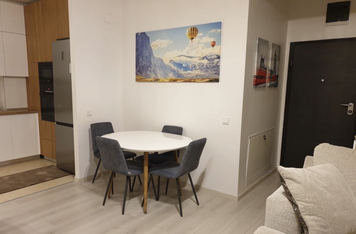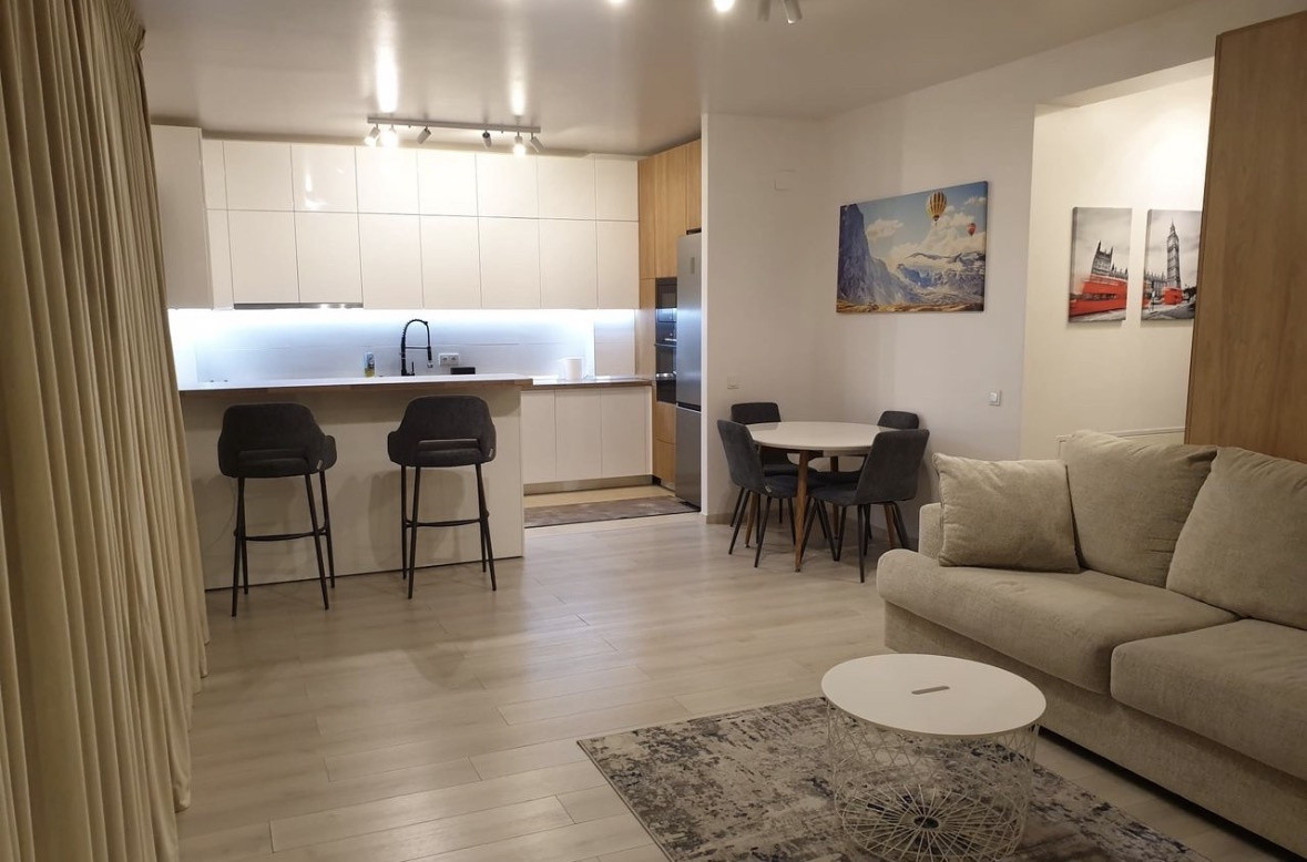 Se vinde mobilat si utilat. Suprafata utila este de 59,39mp, zona de living + bucataria deschisa are 33mp iar dormitorul are 16mp.