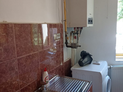 La parter, apartamentul este alcatuit din 4 camere spatioase, o baie, o bucatarie si holl, amenajate modern cu gresie, faianta, dotate cu frigider, masina spalat..etc (3 camere au plafon inalt 3,5 m, parchet din lemn masiv, ferestre termopan, usii moderne, iar o camera are parchet laminat si ferestre lemn.). Incalzirea si necesarul de apa calda sunt asigurate de centrala termica proprie.