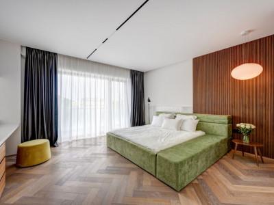 Apartament de 5 camere, 211 mp utili, terasă 36 mp, 4 băi, orientare sud-vest, însorit, cu vedere către pădurea Băneasa. Finisaje high-end și spațiu generos.